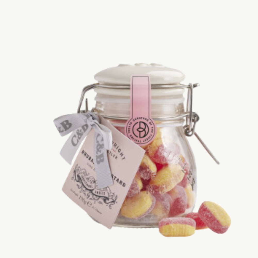 Whoever decided to turn one of life’s great desserts into a sweet treat truly deserves a medal. Our rhubarb and custard boiled sweets capture all the tangy rhubarb and smooth, creamy custard flavor without missing a beat. Presented in one of our signature clip-lid jars with a ceramic lid, these classic sweets are given the respect they deserve.